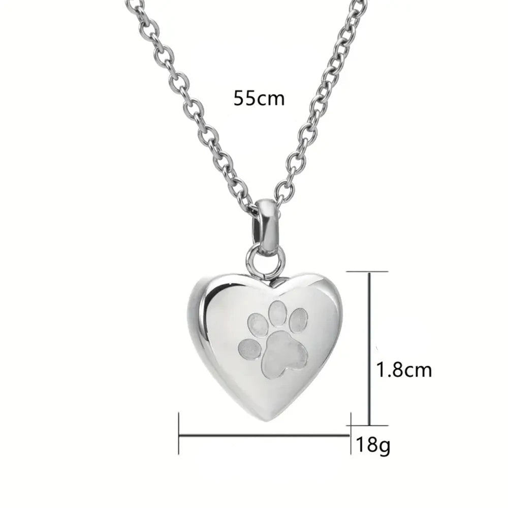 É um pingente-urna feito em aço inoxidável premium, resistente, hipoalergênico e feito para durar a vida inteira. O interior permite armazenar uma pequena quantidade das cinzas, pelos ou até um fragmento simbólico do seu pet.