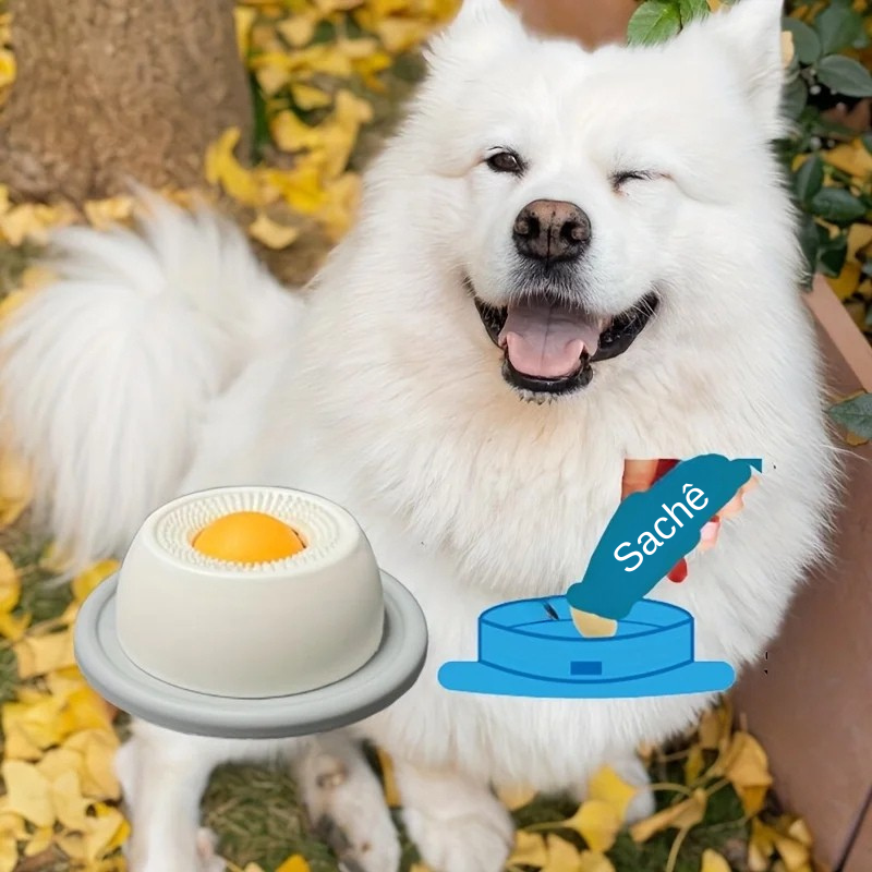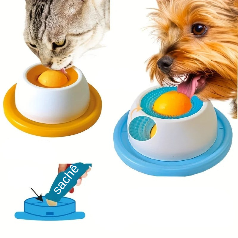 É um comedouro interativo para cães e gatos com textura especial onde você espalha petiscos pastosos (iogurte, ração úmida, patê, pasta de amendoim pet, etc.).